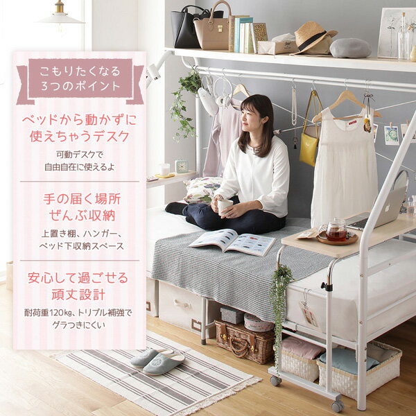 ■サイズ・色違い・関連商品■シングル ブラック ベッドフレームのみ■シングル ブラック ボンネルコイルマットレス付き■シングル ホワイト ベッドフレームのみ[当ページ]■シングル ホワイト ボンネルコイルマットレス付き関連商品の検索結果一覧はこちら■商品内容ずっと居られる、居たくなる、すごもりベッド‐ステーションパイプベッド‐こもりたくなる3つのポイント(1)ベッドから動かずに使えるデスク 可動デスクで自由自在に使える(2)手の届く場所すべてが収納 上置き棚、ハンガー、ベッド下収納スペース(3)安心して過ごせる頑丈設計 耐荷重120kg、トリプル補強でグラつきにくいベッドから動かずに使えるキャスター付きデスク・好きな位置に自由自在に動かせる・自分起点、使いやすい場所に引き寄せて使う・ベッドの外においても使える・ストッパー付きで安定感抜群 ※レバーを下すとロックがかかります・広々スペースでパソコン作業も余裕・デスクと変わらない使い勝手・高さ68cmから88cm便利な高さ調整可能・ベッド×デスクの組み合わせで部屋の過ごし方が変わる棚コンセント付きヘッドボード・枕元にほしいものが置ける棚・スマホの充電に便利な2口コンセント付き・背もたれとしても使えるヘッドボード、デスクを引き寄せれば快適ベッド生活・長時間ベッドで過ごしてもムレにくく快適な通気性抜群のメッシュ構造・ヘッドボードは左右どちらでも付け替え可能です ※お客様が組み立て時にお選びください手の届く場所すべてが収納・上置き棚、ハンガーラック、ベッド下収納スペース・飾るように収納できる広々スペースの上置き棚・身支度も簡単、すぐに服がとれるハンガーラック・自由に使える、ベッド下の大容量収納スペース・このベッド一台でお部屋がすっきり安心して過ごせる頑丈設計・耐荷重120kgの頑丈設計※コイルマットレス専用です・トリプル補強でグラつきにくい (1)補強バー/本体フレームをしっかり固定 (2)クロスバー/グラつきを抑えるクロスバー、結合部には保護カバー付き (3)H字サポートバー/H字サポートバーはボルトでしっかり固定快適へのこだわりへの数々・水、キズ、汚れにつよいPVC加工板・デスクと棚板の角は全てR加工で安全・耐久性に優れた粉体塗装。