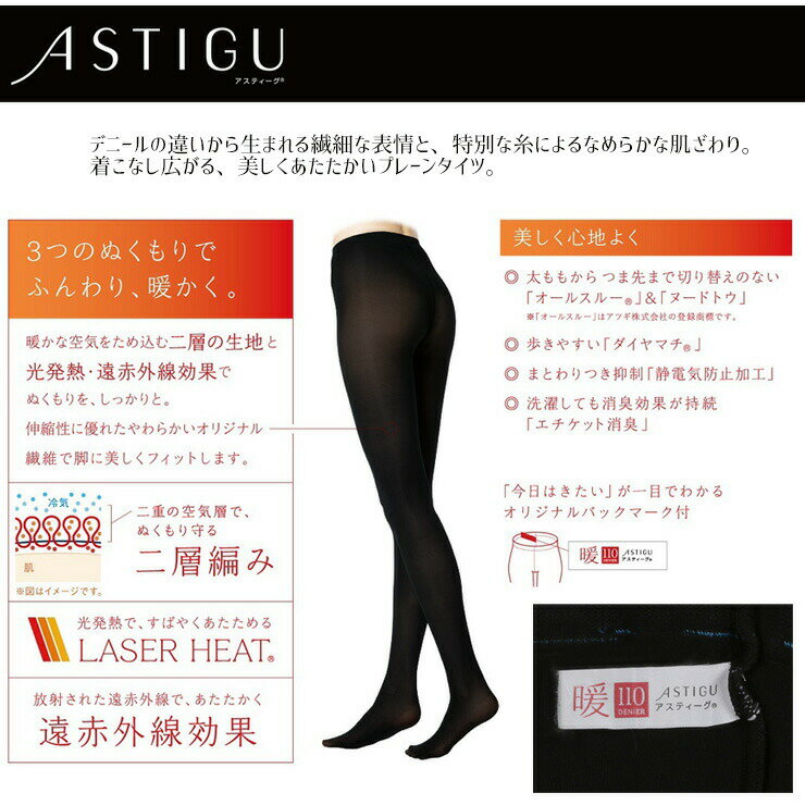 サイズ S〜M(身長:145-160cm、ヒップ:80-93cm) M〜L(身長:150-160cm、ヒップ:85-98cm) L〜LL(身長:155-170cm、ヒップ:90-103cm) 特徴 ASTIGU アスティーグ スタイルに合わせて選べる発熱タイツ。